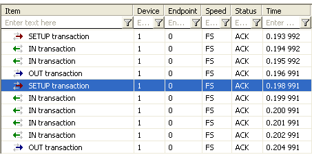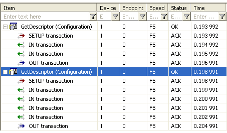 This illustration shows a section of the enumeration of a peripheral. It is possible to specifically distinguish a request made up of six transactions.