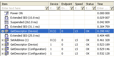 The Power ON element indicates the detection of the power supply provided by the host. This event is followed by an Extended SE0 state caused by the two pull-down resistors of the host. The peripheral then activates its pull-up resistor to signal its presence, what entails a new state change. After detection of the peripheral, the host emits a new Reset before continuing the enumeration fixing the address of the peripheral. We notice on the previous screenshot that about 500 ms are necessary before starting the enumeration.