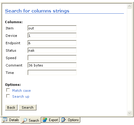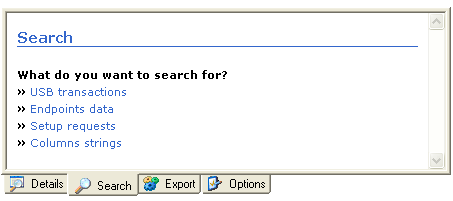 It is possible to search for USB transactions, endpoints data, Setup requests or columns strings. |