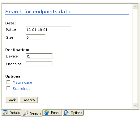 This example shows a search for the hexadecimal pattern '12 01 10 01' in all data packets containing 64 bytes that was not addressed to device 1. |