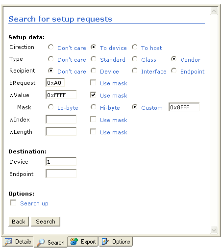 This example shows a search for 0xA0 Setup requests of type vendor in direction of the device. In addition, the wValue field must match the mask 0x8FFF. |