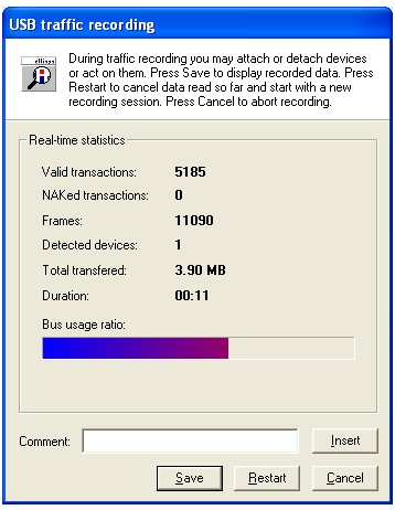This example shows traffic recording for two peripherals, for a period of approximately one minute. The acquisition period is only limited by the computer's available memory. |